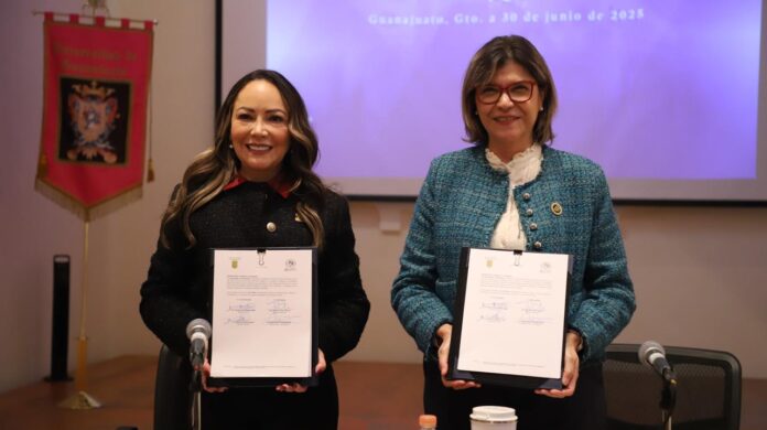 En alianza estratégica para el desarrollo conjunto de actividades que fortalezcan y cumplan los fines en materia de desarrollo sostenible, innovación pública, bienestar social y respeto al entorno cultural y ambiental, la Rectora General, Dra. Claudia Susana Gómez López, en representación de la Universidad de Guanajuato (UG), y la Presidenta Municipal de Guanajuato, Arq. Samantha Smith Gutiérrez, suscribieron un convenio de colaboración.