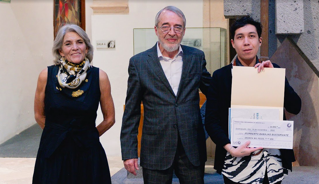 El joven artista guanajuatense Humberto Barajas, como primer lugar, y el estadounidense establecido en Guanajuato Ronald Ribant, en segundo lugar, fueron galardonados en una ceremonia encabezada por Ana Sara Ferrer Bohorques, presidenta de la Fundación Cervantina de México, y Onofre Sánchez Menchero, director del MIQ.