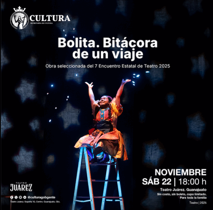 Guanajuato, Gto., 19 de noviembre de 2025.– Después de haber sido seleccionada en el 7º Encuentro Estatal de Teatro, la obra “Bolita. Bitácora de un viaje” llegará a Guanajuato capital para presentarse en el Teatro Juárez este sábado 22 de noviembre a las 18:00 horas.