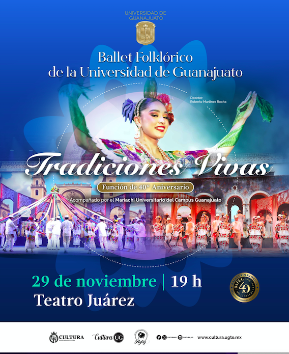 En el marco de su 40º aniversario, el Ballet Folklórico de la Universidad de Guanajuato (Bafug), bajo la dirección del Mtro. Roberto Martínez Rocha, presentará la gala “Tradiciones Vivas”, el 29 de noviembre las 19:00 horas en el Teatro Juárez, una celebración que reúne color, música y expresión escénica para rendir homenaje a la riqueza cultural de México.